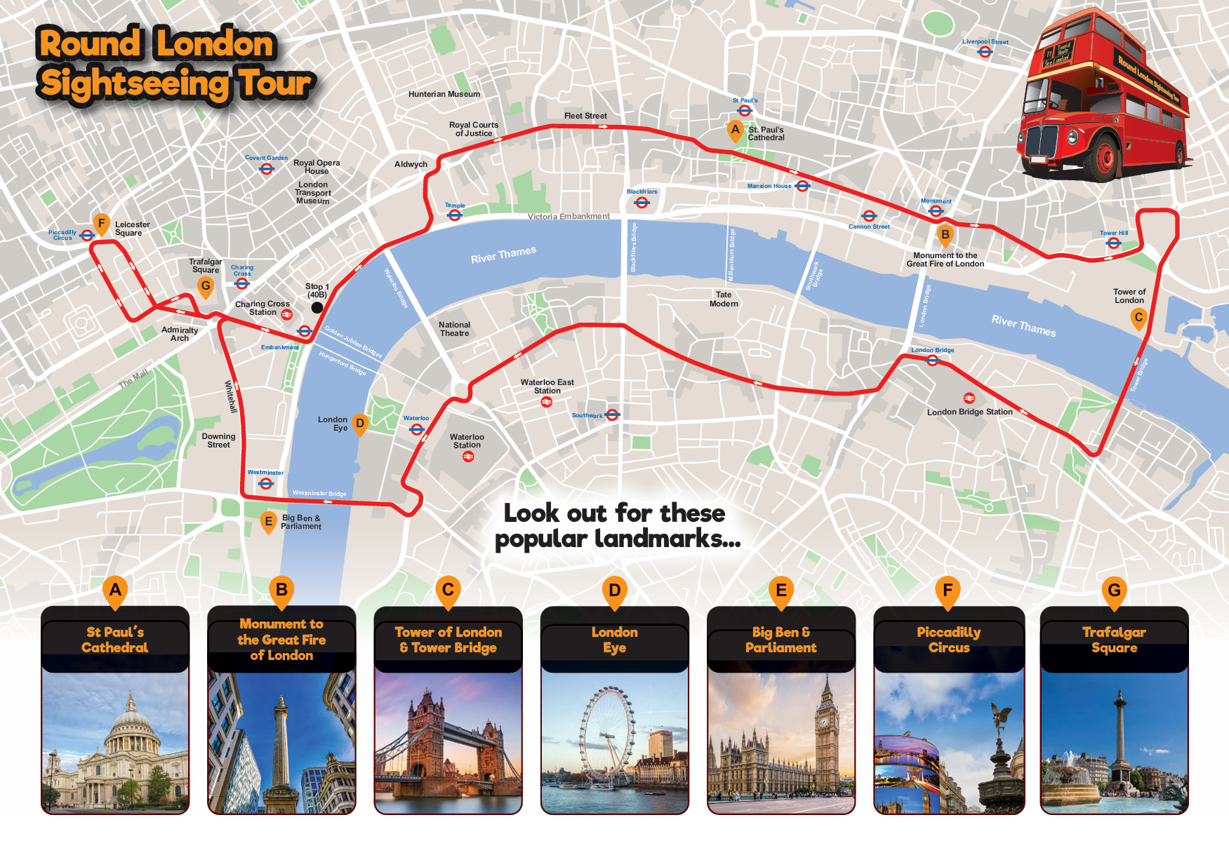 You'll see the Royal Courts of Justice, St.Paul's Cathedral, Monument, Tower of London, Tower Bridge, the London Eye, Big Ben & Parliament buildings, Westminster Abbey, 10 Downing Street & Whitehall, Trafalgar Square and Piccadilly Circus.